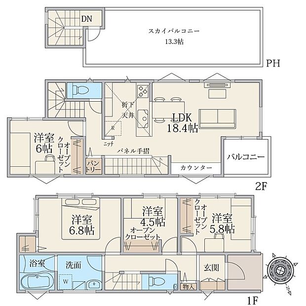 広々とした13.3帖の屋上バルコニーで、趣味の空間を過ごせます!住み心地よい穏やかな地で新生活。天空の家で上質な暮らしを実現 外部の視線に晒されない2階LDK18.4帖でご家族のプライバシーも守ります。書斎や寝室など、家族の成長に合わせて使い分け出来る間取りです。 JR中央・総武線「津田沼」駅 徒歩15分の立地に天空の家が誕生!他 京成線も利用可で、都心や千葉方面への交通アクセスが良好です。ご家族の通勤や通学も便利です。