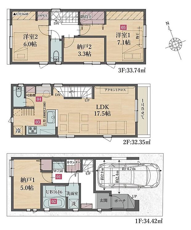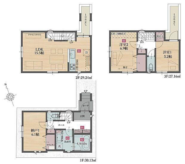 | 建物面積 | 86.53m2(E・F号棟、ポーチ面積1.86m2含む)~102.61m2(C号棟、駐車場・ポーチ面積13m2含む) | ||