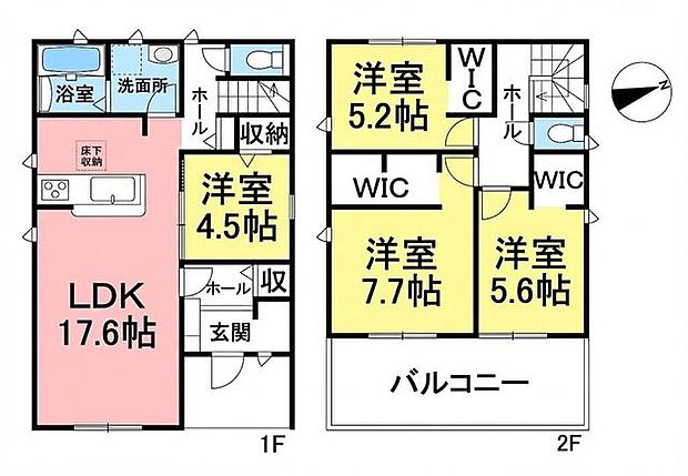 | 間取り | 4LDK 間取り内訳:リビングダイニングキッチン 17.6帖(1階)・洋室 4.5帖(1階)・洋室 7.7帖(2階)・洋室 5.6帖(2階)・洋室 5.2帖(2階) |