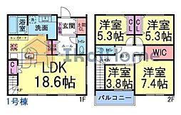 | 間取り | 4LDK 間取り内訳:リビングダイニングキッチン 18帖(1階)・和室 5畳(1階)・洋室 8帖(2階)・洋室 6帖(2階)・洋室 6帖(2階) |