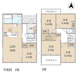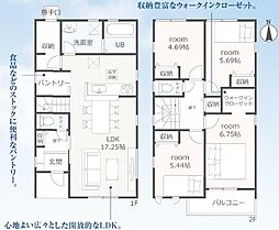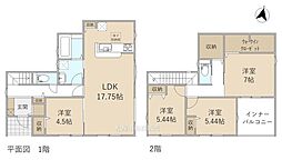 | 間取り | 4LDK 間取り内訳:リビングダイニングキッチン 17帖(1階)・洋室 4.5帖(1階)・洋室 7帖(2階)・洋室 5.4帖(2階)・洋室 5.4帖(2階) |