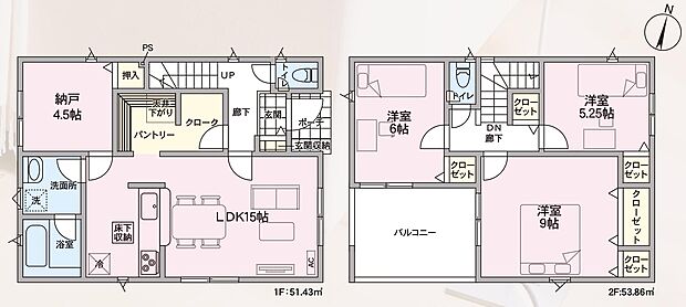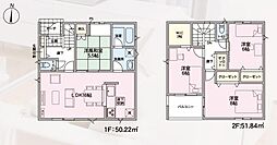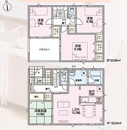 | 間取り | 3SLDK 間取り内訳:リビングダイニングキッチン 15帖(1階)・収納 4.5帖(1階)・洋室 5.2帖(2階)・洋室 6帖(2階)・洋室 9帖(2階) |