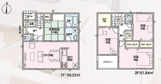 | 間取り | 4LDK 間取り内訳:リビングダイニングキッチン 16帖(1階)・和室 5.5畳(1階)・洋室 6帖(2階)・洋室 6帖(2階)・洋室 8帖(2階) |