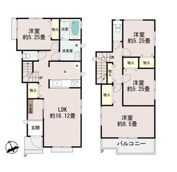 | 間取り | 3SLDK 間取り内訳:リビングダイニングキッチン 16.1帖(1階)・洋室 5.2帖(1階)・洋室 8.5帖(2階)・洋室 5.2帖(2階)・収納 5.2帖(2階) |