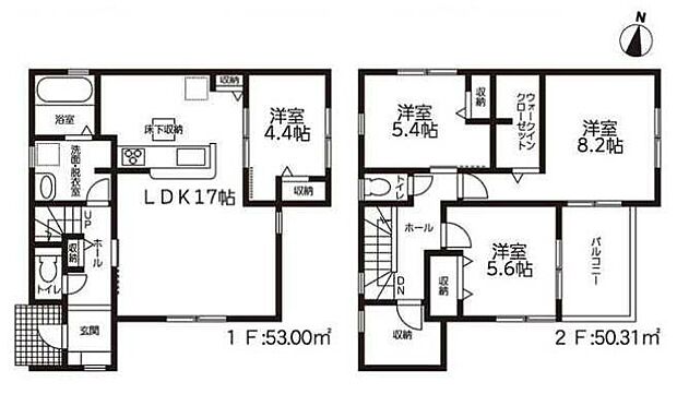 間取り内訳:洋室 5.4帖(2階)・洋室 8.2帖(2階)・洋室 5.6帖(2階)・リビングダイニングキッチン 17帖(1階)・洋室 4.4帖(1階)