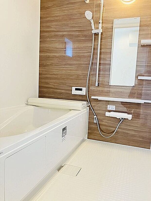 日々の疲れを癒す浴室は広々1坪タイプ。対面式キッチン採用の新築分譲住宅。