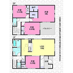 間取り内訳:リビングダイニングキッチン 16帖(1階)・洋室 5.2帖(1階)・洋室 9帖(2階)・洋室 6帖(2階)・洋室 5.3帖(2階)