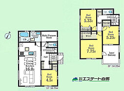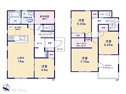 | 間取り | 4SLDK 間取り内訳:リビングダイニングキッチン 16帖(1階)・洋室 4.5帖(1階)・収納(1階)・洋室 7.7帖(2階)・洋室 5.3帖(2階)・洋室 5.2帖(2階) |