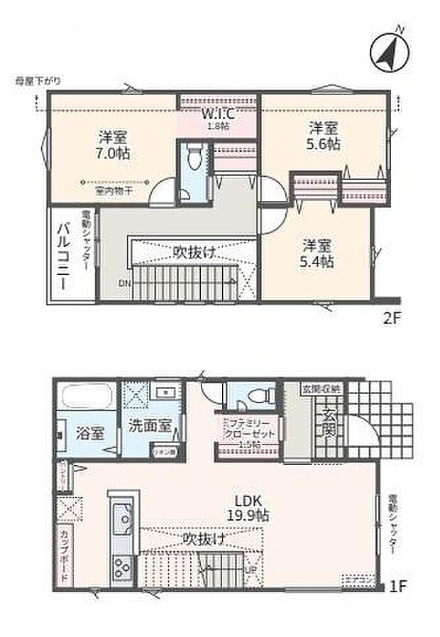 | 間取り | 3LDK 間取り内訳:リビングダイニングキッチン 19.9帖(1階)・洋室 7帖(2階)・洋室 5.6帖(2階)・洋室 5.4帖(2階) |