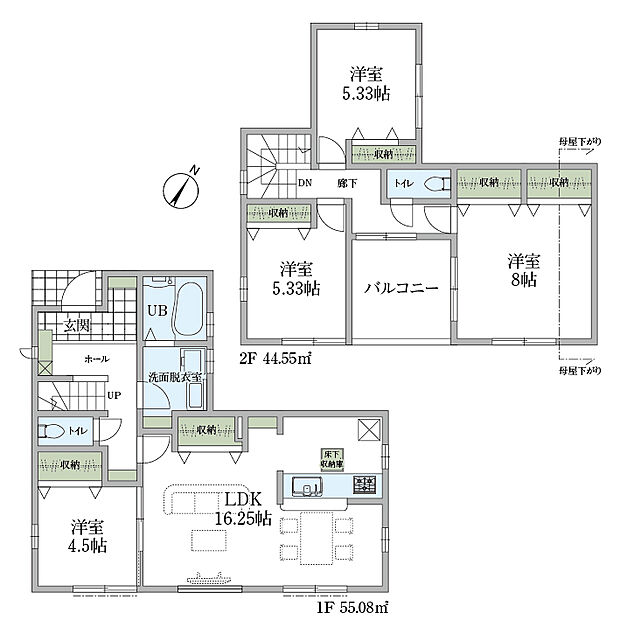 間取り内訳:リビングダイニングキッチン 16.2帖(1階)・洋室 4.5帖(1階)・洋室 8帖(2階)・洋室 5.3帖(2階)x2