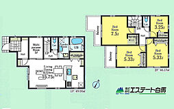 | 間取り | 4SLDK 間取り内訳:リビングダイニングキッチン 15.7帖(1階)・収納 3帖(1階)・洋室 7.5帖(2階)・洋室 5.3帖(2階)x2・洋室 3.2帖(2階) |