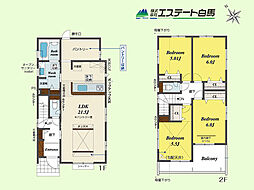 | 間取り | 3LDK(建物面積に玄関ポーチ部分1.12?含む) 間取り内訳:リビングダイニングキッチン 18帖(1階)・洋室 12帖(2階)・洋室 5.2帖(2階)x2 |