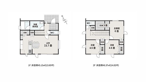 | 間取り | 3LDK 間取り内訳:リビングダイニングキッチン 15.7帖(1階)・洋室 4.5帖(2階)・洋室 4.5帖(2階)・洋室 6帖(2階) |