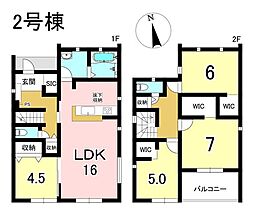 | 間取り | 4LDK 間取り内訳:リビングダイニングキッチン 18帖(1階)・洋室 7帖(2階)・洋室 5帖(2階)x2・洋室 4.5帖(2階) |