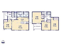 間取り内訳:リビングダイニングキッチン 15.2帖(1階)・洋室 4.7帖(1階)・洋室 8.3帖(2階)・洋室 6.5帖(2階)・洋室 5.9帖(2階)
