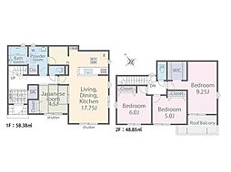 | 間取り | 4LDK 間取り内訳:リビングダイニングキッチン 17.7帖(1階)・和室 4.5畳(1階)・洋室 9.2帖(2階)・洋室 6帖(2階)・洋室 5帖(2階) |