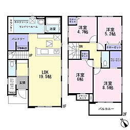 間取り内訳:リビングダイニングキッチン 19.2帖(1階)・洋室 7.5帖(2階)・洋室 6帖(2階)・洋室 5.2帖(2階)・洋室 5.2帖(2階)