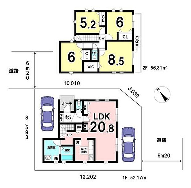 | 間取り | 4LDK 間取り内訳:リビングダイニングキッチン 20.8帖(1階)・洋室 5.2帖(2階)・洋室 6帖(2階)・洋室 6帖(2階)・洋室 8.5帖(2階) |
