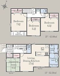 | 間取り | 4LDK 間取り内訳:リビングダイニングキッチン 18帖(1階)・和室 4.5畳(1階)・洋室 8.5帖(2階)・洋室 6帖(2階)・洋室 5.3帖(2階) |