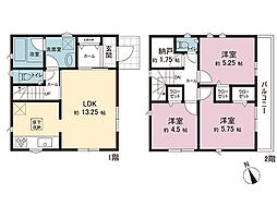 | 間取り | 3SLDK 間取り内訳:リビングダイニングキッチン 13.2帖(1階)・洋室 5.7帖(2階)・洋室 5.2帖(2階)・洋室 4.5帖(2階)・収納 1.7帖(2階) |
