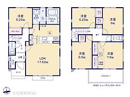 | 間取り | 5LDK 間取り内訳:洋室 5.2帖(1階)・リビングダイニングキッチン 17.6帖(1階)・洋室 7.5帖(2階)・洋室 6.5帖(2階)・洋室 6帖(2階)・洋室 5.2帖(2階) |