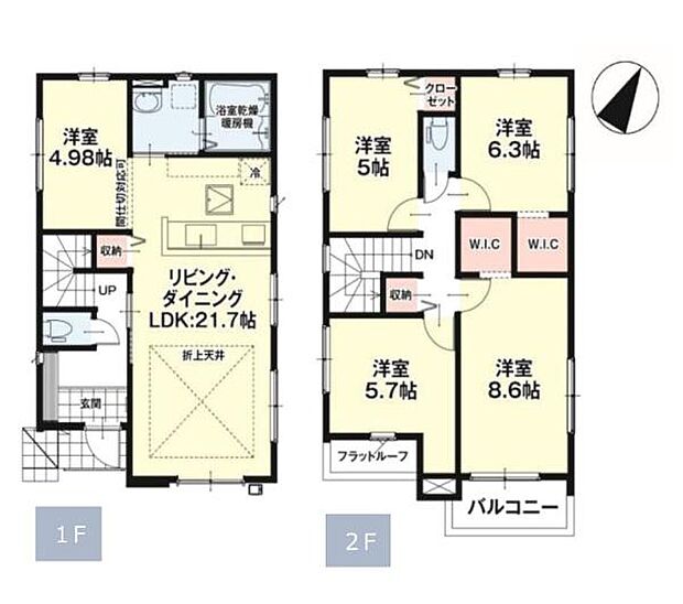| 間取り | 4LDK 間取り内訳:リビングダイニングキッチン 21.7帖(1階)・洋室 5.7帖(2階)・洋室 8.6帖(2階)・洋室 6.3帖(2階)・洋室 5帖(2階) |