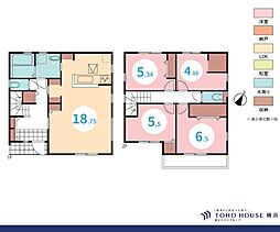 間取り内訳:リビングダイニングキッチン 18.7帖(1階)・洋室 5.3帖(2階)・洋室 5.5帖(2階)・洋室 6.5帖(2階)・洋室 4.8帖(2階)