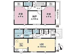 | 間取り | 2SLDK 間取り内訳:リビングダイニングキッチン 13.5帖(1階)・洋室 6帖(2階)x2・収納 4.5帖(2階) |