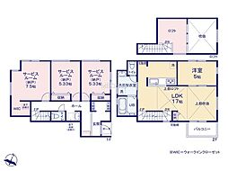 | 間取り | 2SLDK 間取り内訳:洋室 7.5帖(1階)・収納 5.3帖(1階)x2・リビングダイニングキッチン 17帖(2階)・洋室 5帖(2階) |