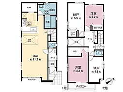 間取り内訳:リビングダイニングキッチン 21.2帖(1階)・洋室 5帖(2階)・洋室 8.2帖(2階)・収納 5.2帖(2階)・収納 5.9帖(2階)