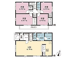 間取り内訳:リビングダイニングキッチン 19帖(1階)・洋室 5.2帖(2階)・洋室 6.7帖(2階)・洋室 4.5帖(2階)・洋室 4.5帖(2階)