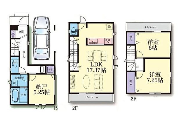 | 間取り | 2SLDK 間取り内訳:収納 5.2帖(1階)・リビングダイニングキッチン 17.3帖(2階)・洋室 6帖(3階)・洋室 7.2帖(3階) |