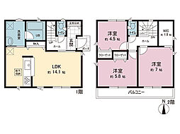 | 間取り | 3SLDK(LDK16帖・リビング階段・その他は洋室仕様) 間取り内訳:リビングダイニングキッチン 16帖(1階)・洋室 4.5帖(2階)・洋室 6帖(2階)・洋室 6.1帖(2階)・収納 4.5帖(2階) |