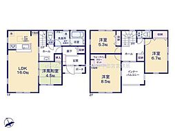間取り内訳:リビングダイニングキッチン 13.5帖(1階)・洋室 6帖(2階)・収納 4.5帖(2階)・洋室 6帖(2階)