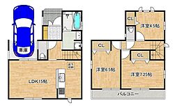 | 間取り | 3LDK 間取り内訳:リビングダイニングキッチン 15帖(1階)・洋室 7.2帖(2階)・洋室 6.5帖(2階)・洋室 4.5帖(2階) |
