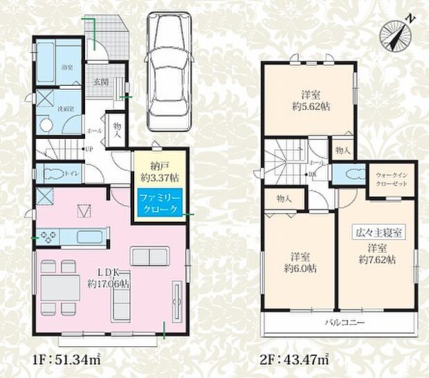 | 間取り | 3LDK 間取り内訳:リビングダイニングキッチン 17帖(1階)・収納 3.3帖(1階)・洋室 5.6帖(2階)・洋室 6帖(2階)・和室 7.6畳(2階) |