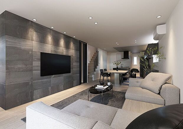質感豊かなリビングのアクセントウォールと調和し、落ち着きのある家族の憩いの場を演出。ゆとりとくつろぎが織成すファミリー空間。
