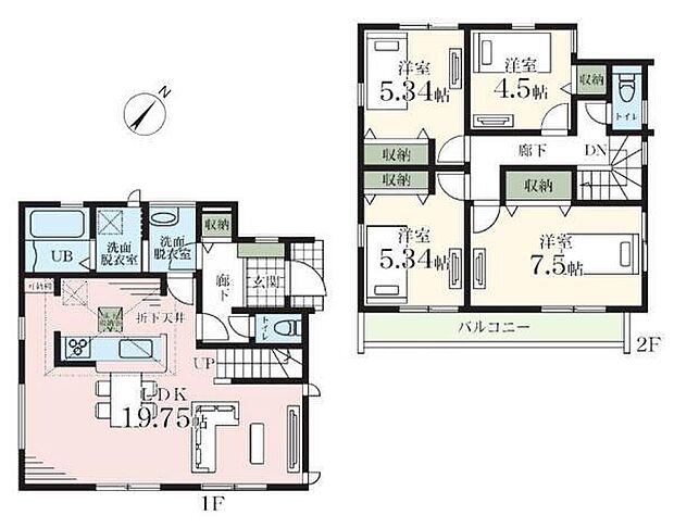 間取り内訳:リビングダイニングキッチン 19.7帖(1階)・洋室 5.3帖(2階)・洋室 5.3帖(2階)・洋室 7.5帖(2階)・洋室 4.5帖(2階)
