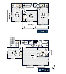 間取り内訳:リビングダイニングキッチン 19.7帖(1階)・洋室 5.3帖(2階)・洋室 5.3帖(2階)・洋室 7.5帖(2階)・洋室 4.5帖(2階)
