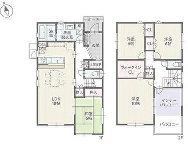 | 間取り | 4LDK 間取り内訳:洋室 6帖(2階)・リビングダイニングキッチン 18帖(1階)・和室 6畳(1階)・洋室 10帖(2階)・洋室 6帖(2階) |
