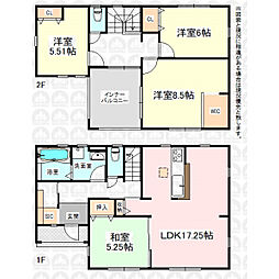 間取り内訳:リビングダイニングキッチン 16帖(1階)・和室 5.2畳(1階)・洋室 5.3帖(2階)・洋室 6.2帖(2階)・洋室 8.5帖(2階)