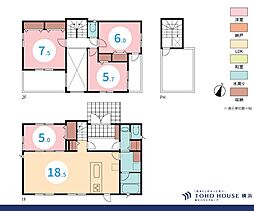 間取り内訳:リビングダイニングキッチン 18.5帖(1階)・洋室 5帖(1階)・洋室 7.5帖(2階)・洋室 5.7帖(2階)・洋室 6帖(2階)
