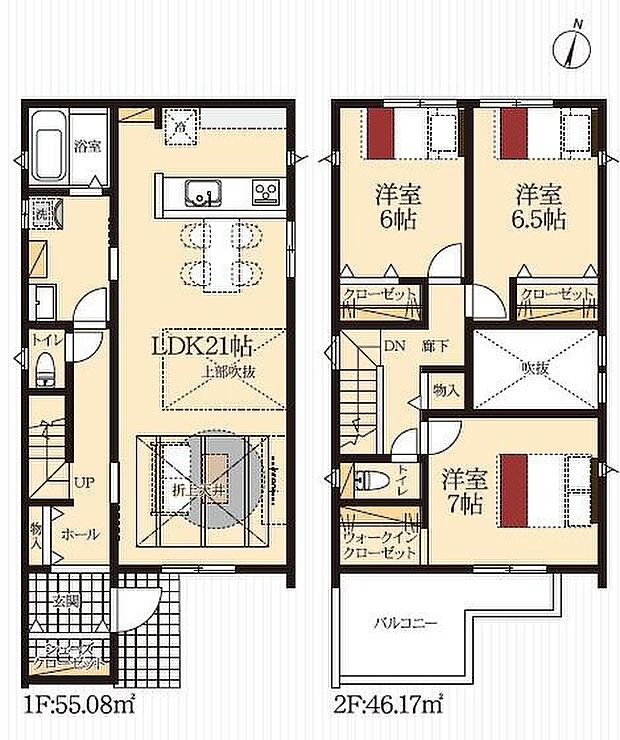 | 間取り | 3LDK 間取り内訳:リビングダイニングキッチン 21帖(1階)・洋室 7帖(2階)・洋室 6.5帖(2階)・洋室 6帖(2階) |