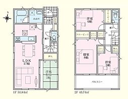 | 間取り | 4LDK 間取り内訳:リビングダイニングキッチン 17帖(1階)・和室 5畳(1階)・洋室 6帖(2階)・洋室 5帖(2階)・洋室 8帖(2階) |