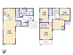 | 間取り | 3LDK(将来4LDKに対応可。) 間取り内訳:リビングダイニングキッチン 18.6帖(1階)・洋室 4.6帖(2階)・洋室 8.3帖(2階)・洋室 9.7帖(2階) |