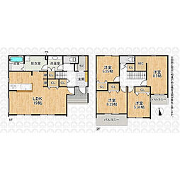 間取り内訳:リビングダイニングキッチン 19帖(1階)・洋室 5.2帖(2階)・洋室 6.2帖(2階)・洋室 5.3帖(2階)・洋室 8.5帖(2階)