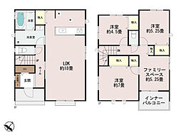 | 間取り | 3LDK((1F)LDK17.2帖 (2F)洋6帖・洋5.2帖・洋4.5帖・ファミリースペース5帖) | 建物階 | 地上2階 |