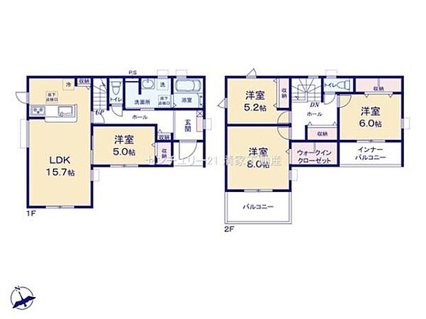 | 間取り | 4LDK 間取り内訳:リビングダイニングキッチン 15.7帖(1階)・洋室 5帖(1階)・洋室 8帖(2階)・洋室 6帖(2階)・洋室 5.2帖(2階) |