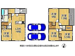 | 間取り | 4LDK(カーテン・照明・家具・家電等は付きません。住宅ローン借入にてご準備もできます。詳細はお問合せください) 間取り内訳:リビングダイニングキッチン 16帖(1階)・和室 3畳(1階)・洋室 6.5帖(2階)x2・洋室 6帖(2階) |