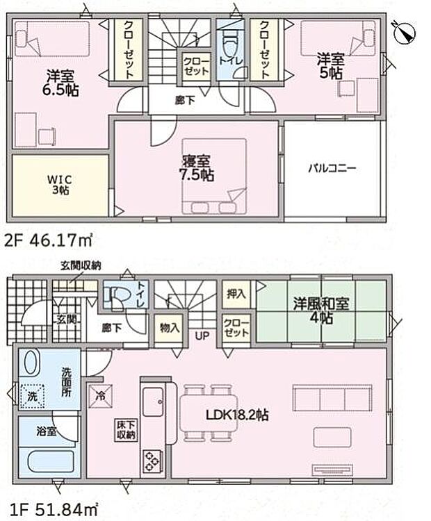 | 間取り | 4LDK 間取り内訳:リビングダイニングキッチン 18.2帖(1階)・和室 4畳(1階)・洋室 7.5帖(2階)・洋室 6.5帖(2階)・洋室 5帖(2階) |